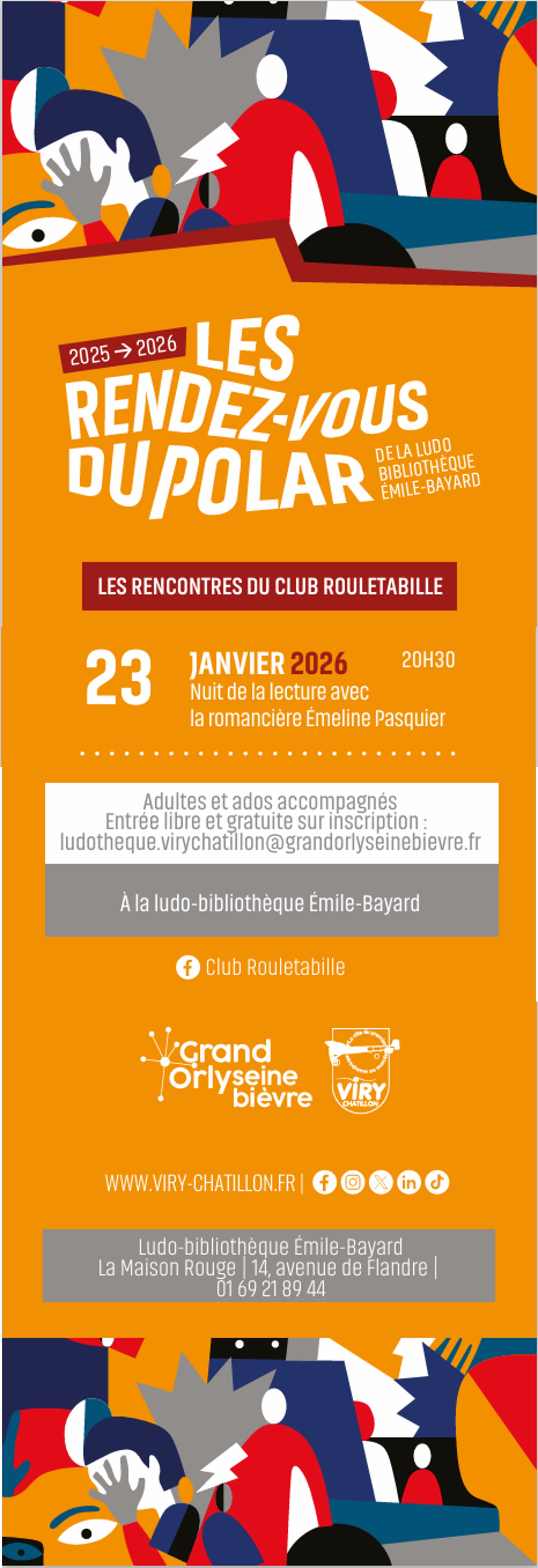 Émeline Pasquier en dédicace à la Nuit de la lecture organisée par la Ludo bibliothèque Émile Bayard, à Viry-Châtillon, dans le cadre des rendez-vous du polar et rencontres du Club Rouletabille. Infos et réservations.